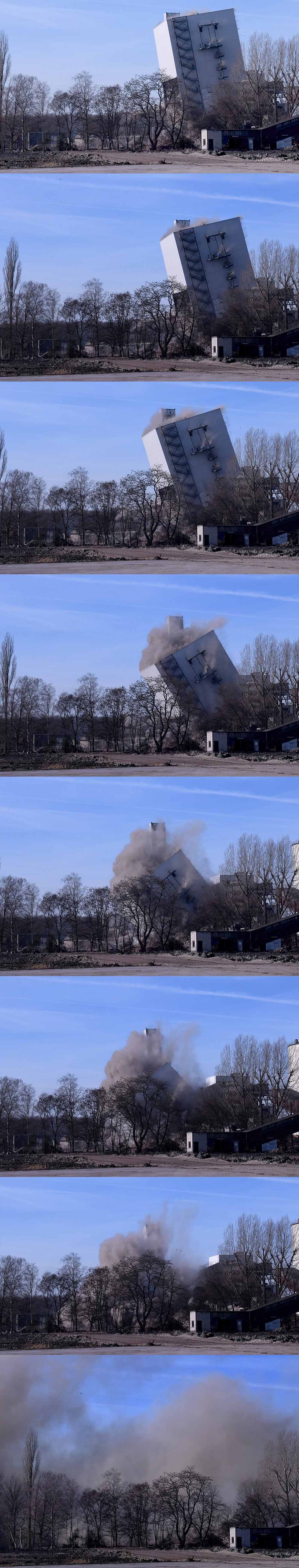 Zunächst wurde um 11.25 Uhr wurde das Kesselhaus mit angrenzendem Treppenhaus/ Fahrstuhlschacht gesprengt. Rund acht Kilogramm gelatinöser Sprengstoff und eine geringe Menge plastifizierter Sprengstoff haben exakt bis zu 63 Millimeter Stahldicke durchtrennt. So landete nach vier Sekunden das Gebäude passgenau in dem dafür vorbereiteten Fallbett. Übrig bleiben gut 9.500 Tonnen Stahlschrott. Um diese Präzision zu erreichen, wurden im Vorfeld einige Probesprengungen zu Messzwecken durchgeführt.