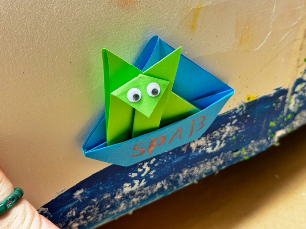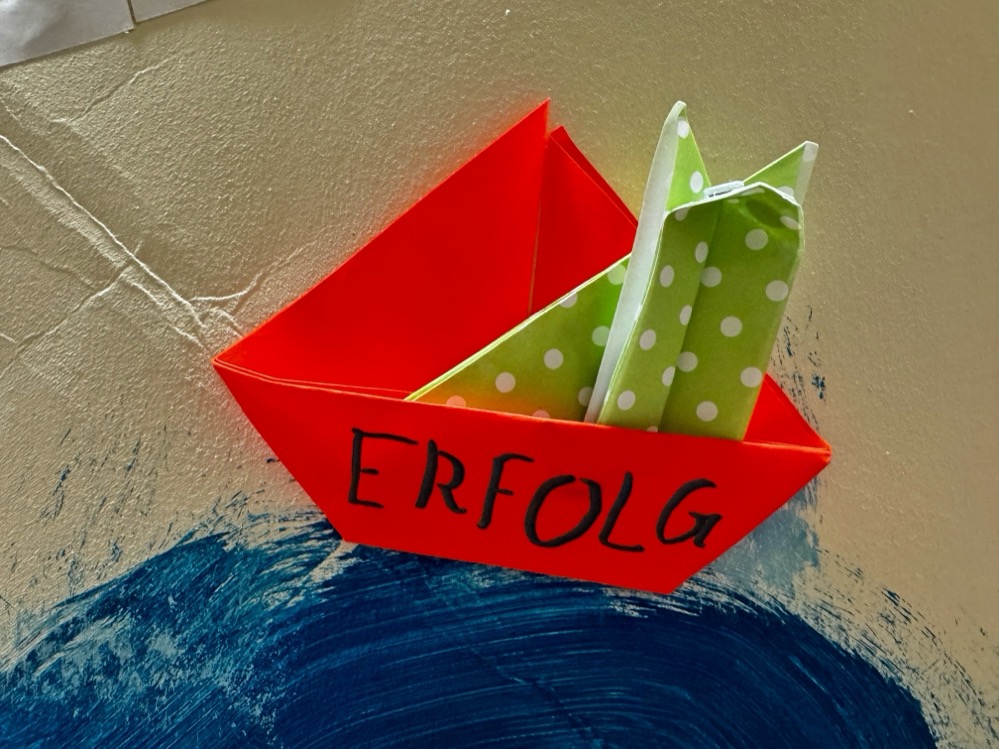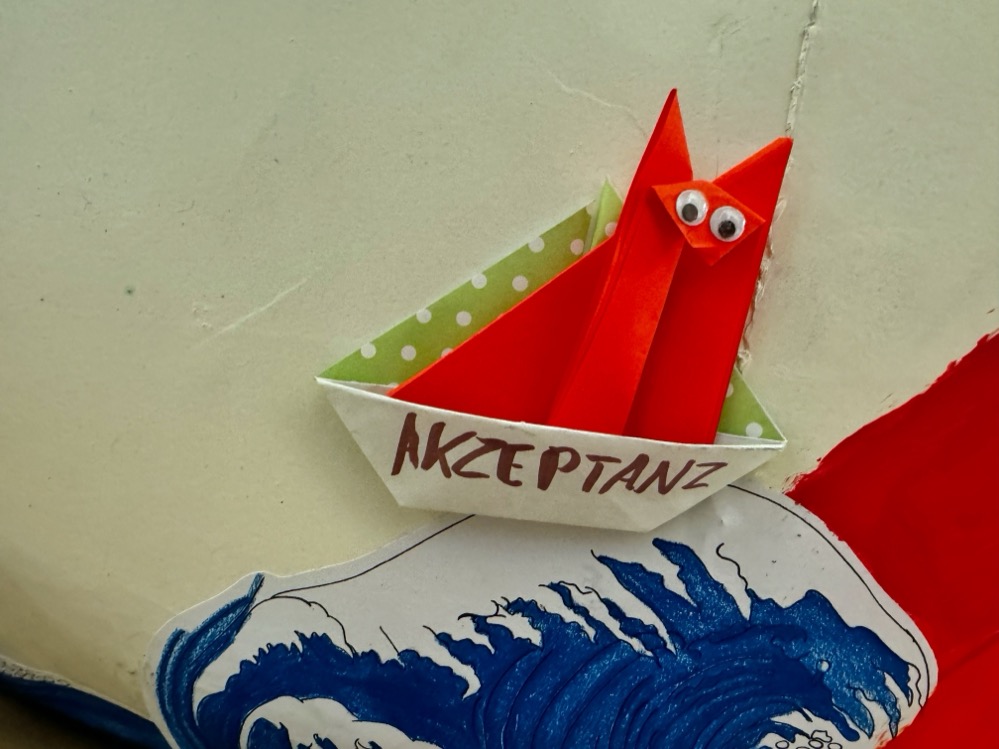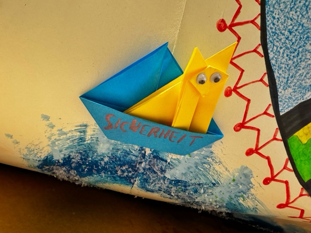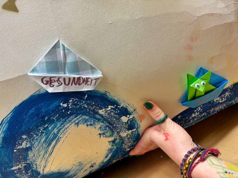 „Sie haben Texte und Symbole rausgesucht, formuliert, was sie den Menschen auf der Welt wünschen würden und haben aus Origami kleine Boote gebastelt, mit denen sie das große Papierschiff gestaltet haben“, berichtet Theaterpädagogin Laura Gebauer. Sie haben das komplett selbst gebastelt, ihre Motive skizziert und das Boot aufgebaut und gestaltet. Sie hoffen, dass es in Berlin ankommt.“