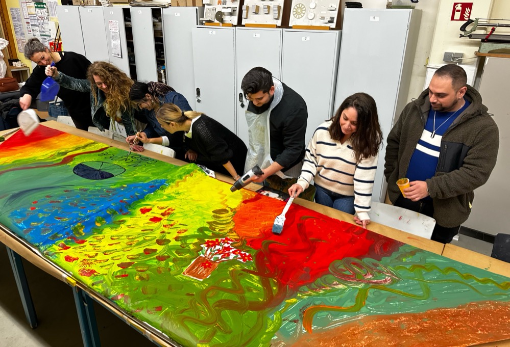 In Dortmund wurden gleich zwei Boote gestaltet: Die Migrationsdienste sind mit ihren Roma-Bildungsmediator:innen vom Projekt „Vast vasteste – Hand in Hand in NRW“ mit an Bord. Die Mediator:innen haben ihre „Bootschaften“ sehr farbenfroh und leidenschaftlich auf den fünf Meter langen Papierbooten aufgetragen – so intensiv und vielschichtig, dass es mehr als eine Woche dauerte, bis diese in der Malerwerkstatt getrocknet war.