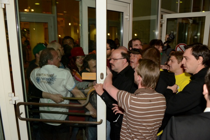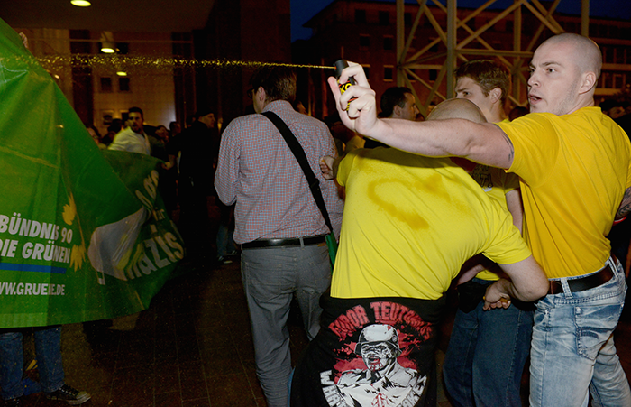 Eine Gruppe Neonazis unter Führung von Siegfried Borchert und Dennis Giemsch versuchte, sich mit Gewalt und unter Ausrufen ausländerfeindlicher Parolen sowie Absingen der ersten Strophe des Deutschlandliedes gewaltsam einen Weg durch die Rathaus-Beschützer zu verschaffen.