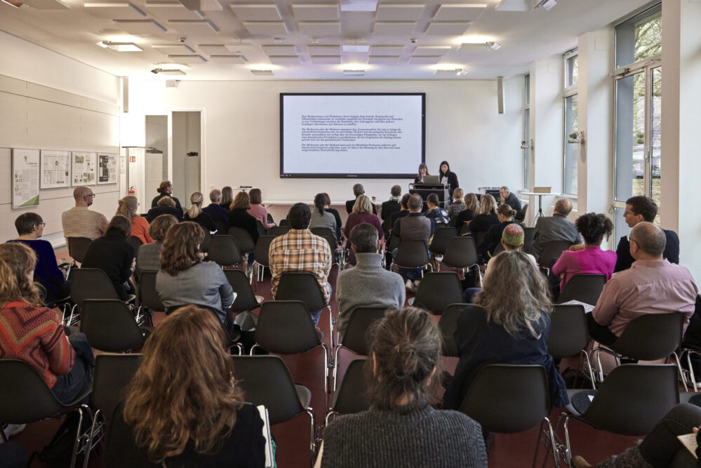 Zwei Tage lang gab es Vorträge von Expert:innen aus Museen, der Verwaltung und der Kunstszene. Zum Abschluss zogen vier Teilnehmer:innen in einer Podiumsdiskussion ihr Fazit: Initiator Jacques Heinrich Toussaint, Rebekka Seubert (Künstlerische Leiterin, Kunstverein Dortmund), Denise Ritter (Dortmunder Künstlerin) und Kay von Keitz (Kurator und Autor).
