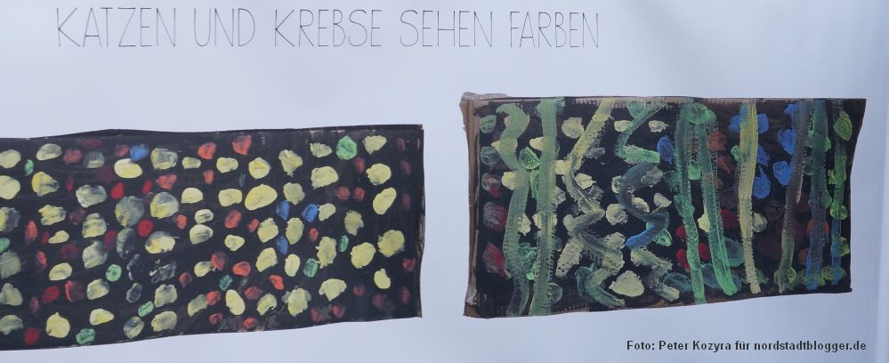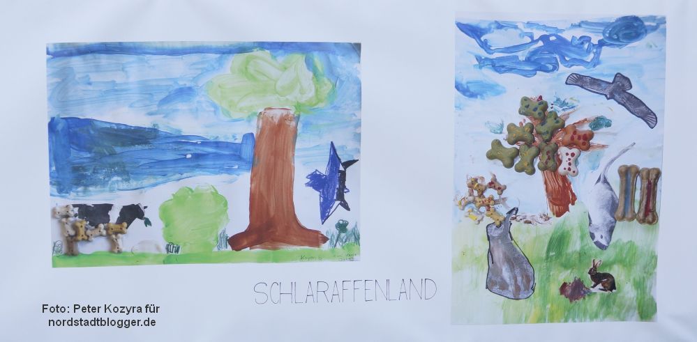 „Die Grundidee war es, die Kinder Kunst aus der Sicht von Tieren erstellen zu lassen“, erklärt Goedert. „Wie nehmen Tiere die Welt wahr, wie würde ein Einkaufs-Prospekt oder das Schlaraffenland für Tiere aussehen? Welche Kunst würde meinem Haustier gefallen?“ Unter diesen Fragestellungen erarbeiteten die 30 teilnehmenden Kinder ihre grob 70 Kunstwerke.