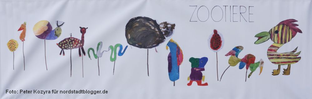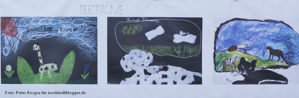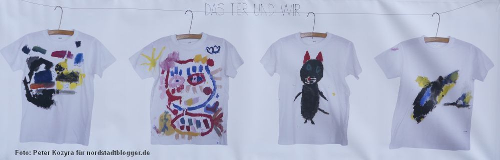 „Ist meines auch dabei?“ fragt ein kleines Mädchen mit großen Augen. Johanna Goedert, eine von drei Leiterinnen der Kunstkurse für 4- bis 14-jährige antwortet: „Alle sind dabei“. Auf einer Ausstellungsfläche von 56 laufenden Metern sind bei der Eröffnung der „Ausstellung für Tiere“ auf dem Vorplatz des Dortmunder U-Turms tatsächlich viele Kunstwerke zu sehen. Von Collagen über Bilder, selbst gestaltete T-Shirts, Vogelnester bis hin zu gebastelten Körben und Häuschen für Haustiere ist alles vertreten.