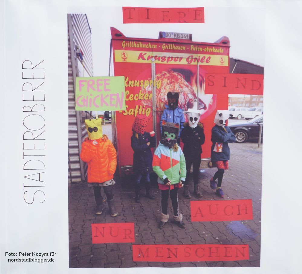 Mit diesen spazierte sie im Anschluss maskiert durch die Stadt. Dabei eroberten sich die Kinder ihre Umwelt aus der Sicht der Tiere. „Es ergaben sich viele spontane und witzige Momente, wie der, als die Kinder plötzlich vor einem Grillhähnchenstand für die Rechte von Hühnern demonstrierten.“