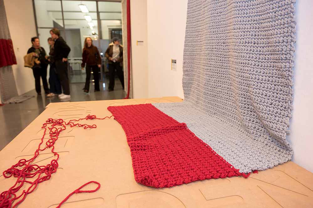 Sowohl die Arbeit des Häkelns als auch das Material der Wolle werden kulturell stark mit Weiblichkeit assoziiert. Hier imitieren gehäkelte große Flächen klassische Darstellungen von Grafiken, wie wir sie aus der Wissenschaft kennen“, sagt Prof. Nikola Ukić.