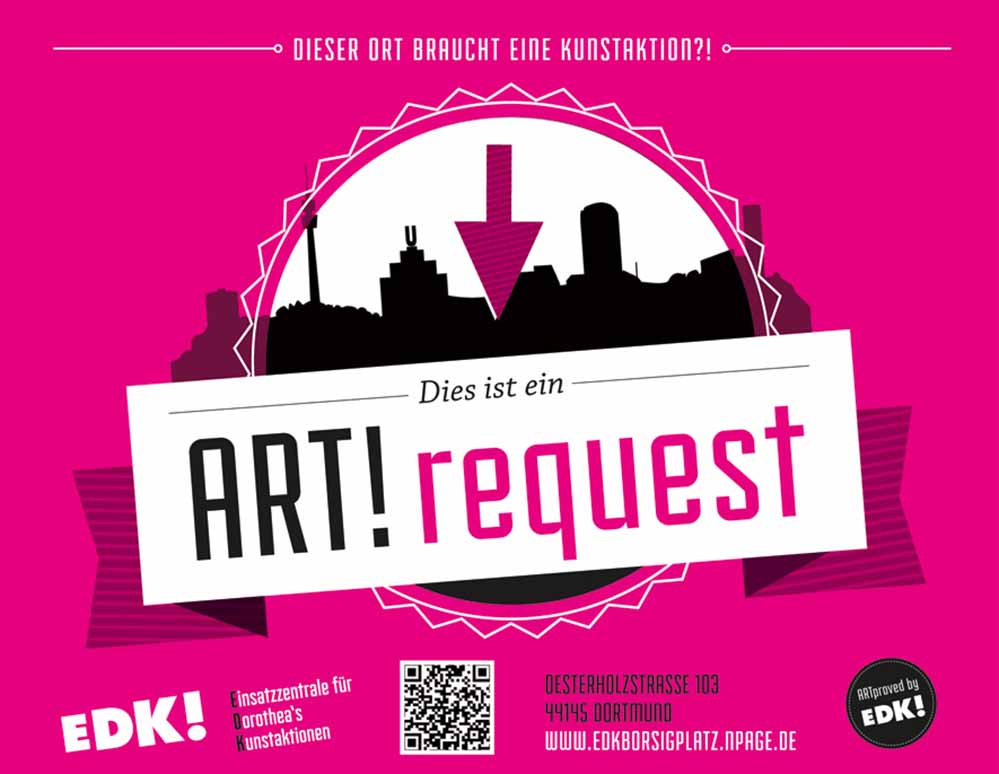 Dorothea Eitel ist Tänzerin und Choreografin. Sie sucht Komplizen am Borsigplatz, die öffentliche Orte bestimmen, die ihrer Ansicht nach eine Kunstaktion gebrauchen können. Hierfür stellen sie ein ArtRequest, markieren den Punkt mit einem Aufkleber und suchen Fürsprecher, die diese Anfrage bestätigen. In Zusammenarbeit mit ihren Komplizen erarbeitet die Künstlerin dann eine Intervention, die den Ort in ein neues Licht rückt.