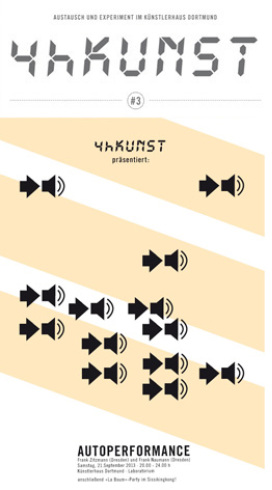 Die Aktion „4hKUNST“ des Künstlerhauses geht an 21. September in die dritte Runde. »AUTOPERFORMANCE« ist das Motto zur Aktion mit Frank Zitzmann & Frank Naumann, die eine Minute Sound an öffentlichen Plätzen in Dortmund zelebrieren.