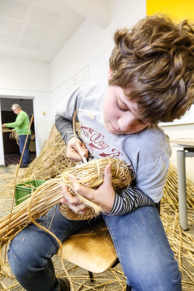 Geschäftige Stille herrscht an diesem Samstagmittag im Klassenraum der ehemaligen Greveler Grundschule. Mitgleider des Imkervereins Husen-Kurl sitzen zwischen Strohbüscheln, die Köpfe gebeugt über ihren Werkstücken, die langsam Form annehmen. Sie machen Bienenkörbe. Und sie machen das, wie es ihre Imkerkollegen vor 200 Jahren auch schon gemacht haben: In Handarbeit und mit dem, was zur Hand war und ist. Die Werkzeuge sind wenige und einfache – ein Stecheisen und ein Schraubenzieher, das Material ist das Roggenstroh. „Mir macht das richtig Spaß. Obwohl ich gedacht haben, dass das schneller geht“, sagt Rita Breker-Kremer.