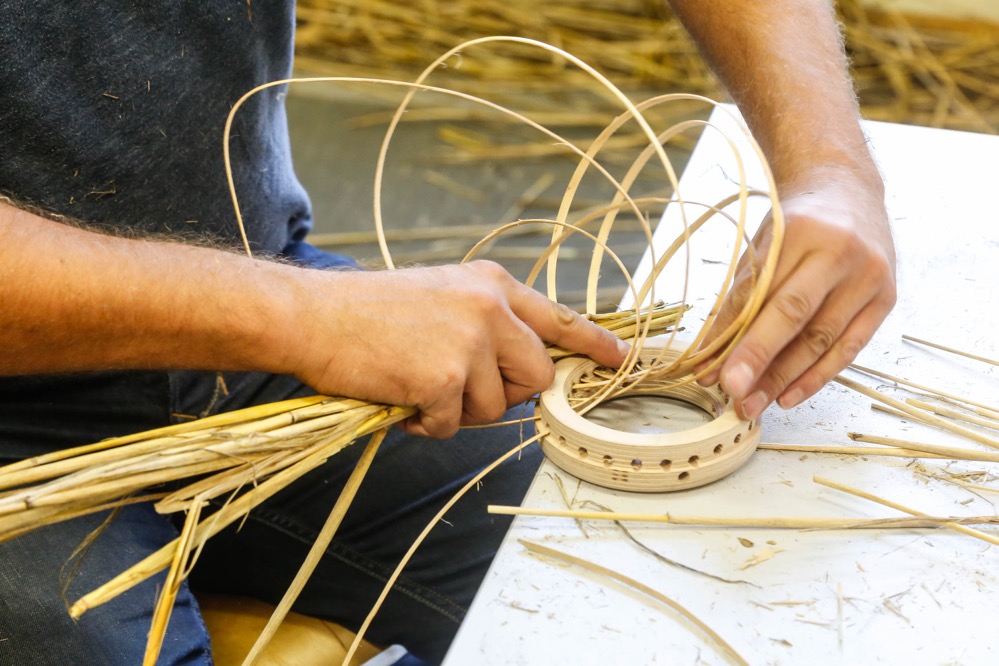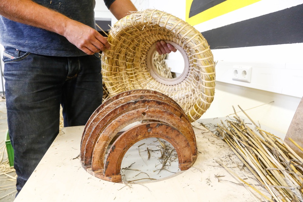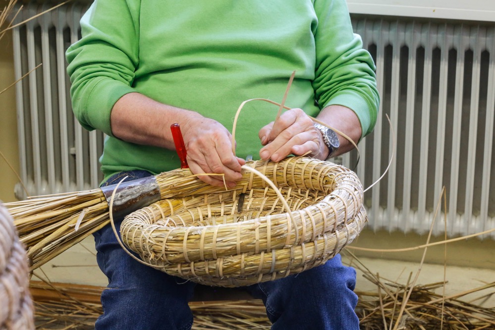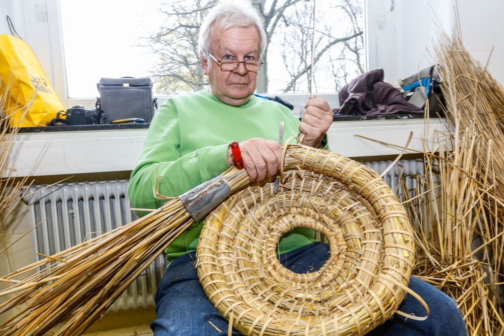 Ein Bündel Stroh wird ein wenig gedreht und dadurch geschmeidig gemacht, durch einen Führungstrichter geschoben und mit einem Bambusband umwickelt. „Der Trichter muss immer gleichmäßig voll sein, damit die Wand nicht unterschiedlich dick wird“, erzählt Siegfried Rinke, der 2. Vorsitzende des Vereins, und zeigt, was er gelernt hat.