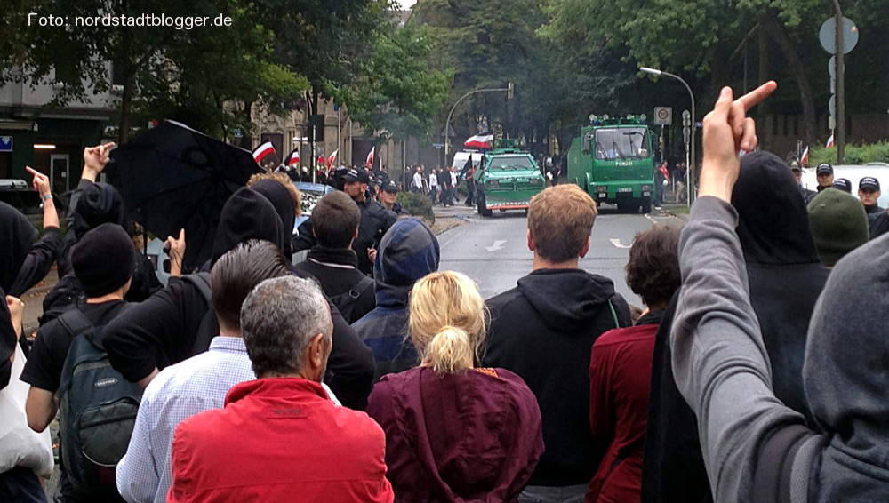 Aber auch auf Seiten der Rechten kam es zu einigen Auseinandersetzungen. Gegen Ende des Aufmarschs eskalierte die Lage, als aus Reihen der Neonazis Böller auf Gegendemonstranten flogen. Fünf Menschen wurden verletzt – darunter auch eine Landtagsabgeordnete der Piraten und ein Polizist. „Die Tatsache, dass die Rechtsextremisten für Gewalt und Verletzte verantwortlich sind, entspricht nicht den Erwartungen an eine demokratische Partei“, so Polizeipräsident Norbert Wesseler. Der rechte Gewalttäter hatte aus dem Schutz der Versammlung heraus auf kritische Meinungsäußerungen mit Böllerwürfen reagiert. Gegen ihn wird u.a. wegen des Verdachts der gefährlichen Körperverletzung ermittelt. Die Einsatzkräfte zeigten sich insgesamt besonnen und ließen auch friedliche Gegendemonstranten in Rufweite von Neonazis gewähren.