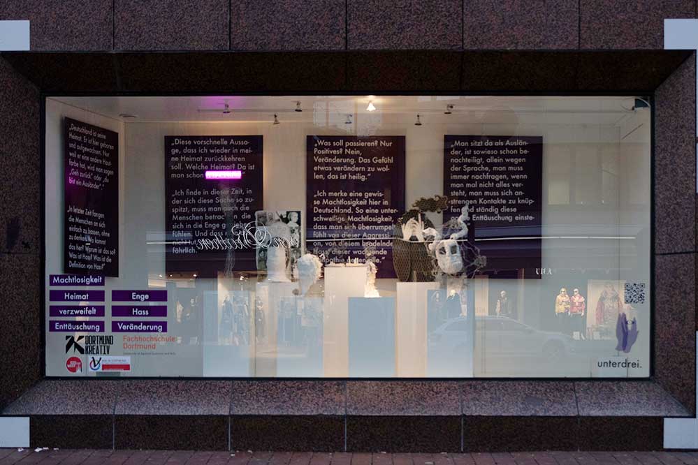 „Diese vorschnelle Aussage, dass ich wieder in meine Heimat zurückkehren soll. Welche Heimat?“ Rassismus: eine alltägliche Erfahrung für Betroffene. Das will das Kollektiv „unterdrei“ durch eine Schaufensteraustellung in der Dortmunder Innenstadt beleuchten. Damit eröffnen sie ihre Projektreihe „Licht an“. Mit dem Konzept wollen die drei Studierenden Lynn Lipka, Mariele Key und Marie Schönenborn kreativ auf gesellschaftliche Probleme hinweisen. Gemeinsam studieren sie Objekt- und Raumdesign an der FH Dortmund.