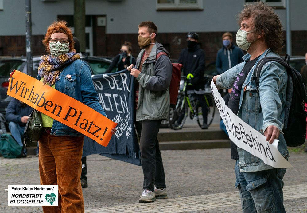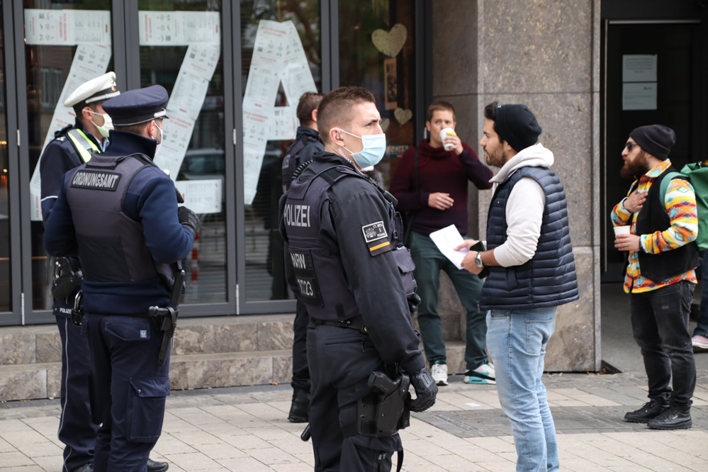Unter dem Moto „#Grenzenlos Solidarisch“ hatte ein Bündnis aus verschiedenen linken Gruppierungen eine Versammlung auf dem Sonnenplatz angemeldet. Die Um- und Durchsetzung der Vorschriften fiel hier allerdings deutlich schwerer. Ein Grund: Der Platz war zu klein. Die Initiator*innen hatten 30 Personen angemeldet – es sollen jedoch 150 Menschen gewesen sein, die zeitweise vor Ort waren.