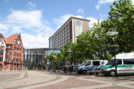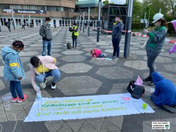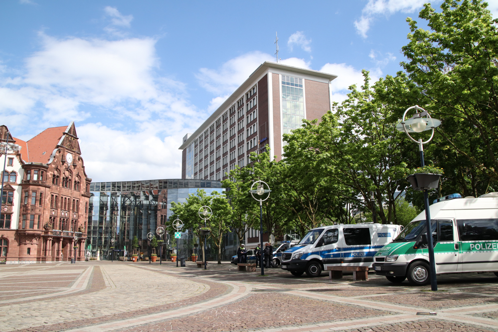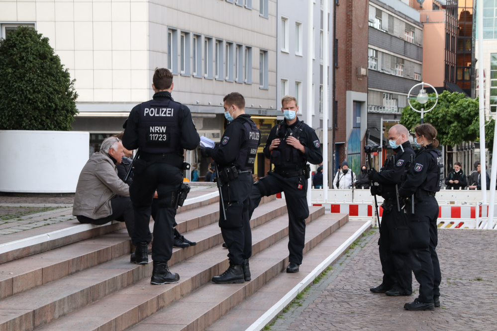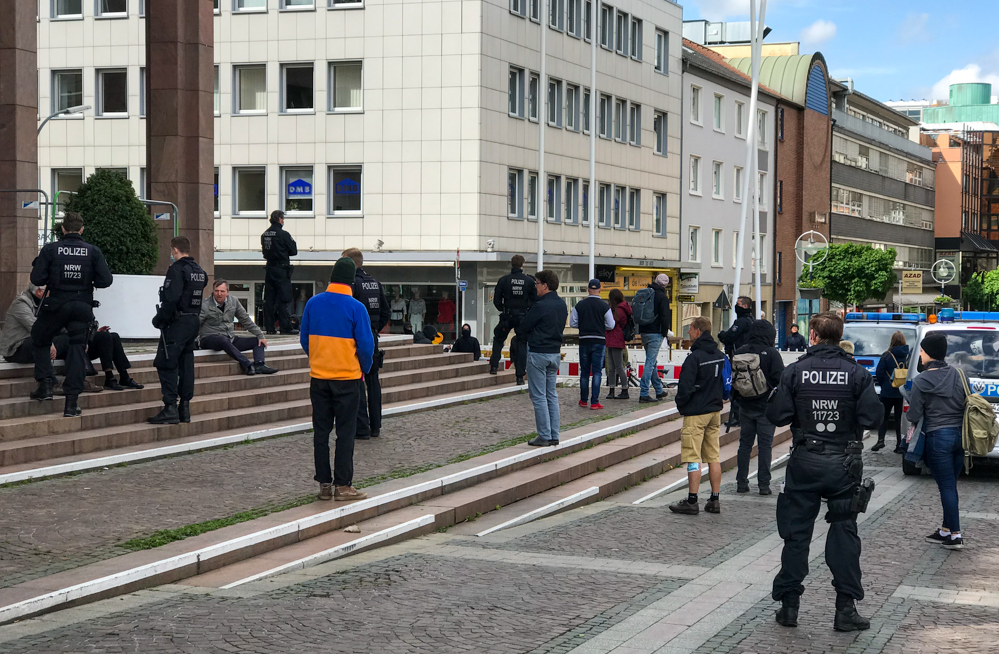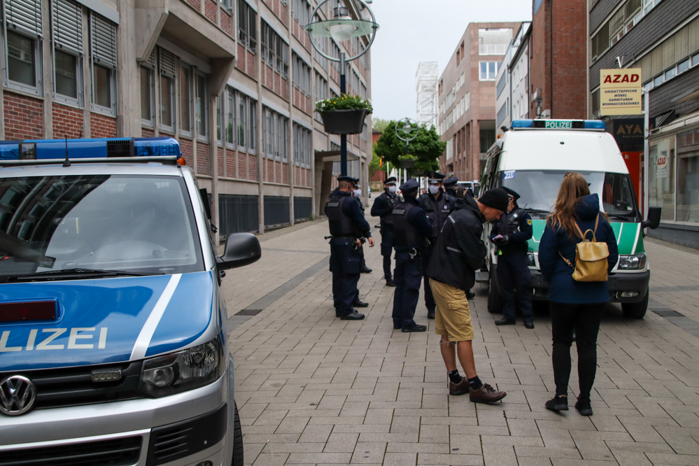 Demonstrieren in Zeiten von Corona – eine besondere Herausforderung. Während der DGB die offiziellen Veranstaltungen absagte und erstmals einen virtuellen Tag der Arbeit abhielt, hatten kleinere Gruppen mildere Auflagen mit gerichtlichem Segen durchgesetzt, um den 1. Mai als „Internationalen Kampftag der Arbeiterklasse“ zu begehen (auf dem Platz der Alten Synagoge) oder ein Zeichen gegen die derzeitige Flüchtlingspolitik zu setzen (Sonnenplatz). Auf dem Friedensplatz hingegen wurde eine Veranstaltung von Impfgegnern und Verschwörungstheoretikern  – so zumindest die Aussage von Augenzeugen – von der Polizei beendet und der Platz geräumt.