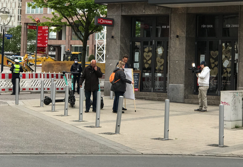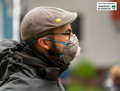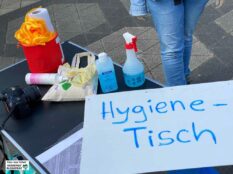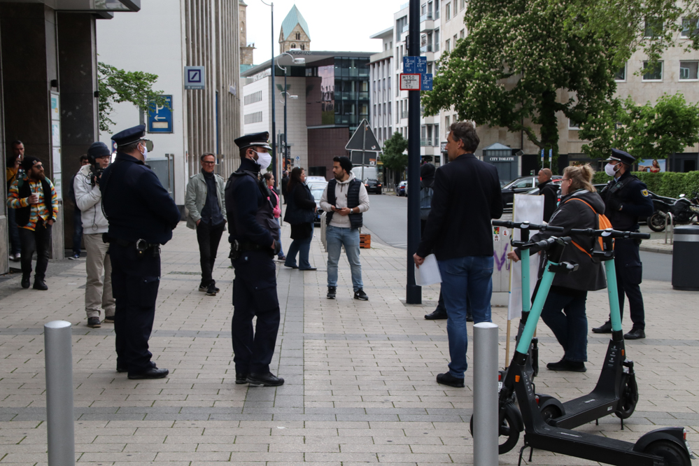 Die Umsetzung der anderen Auflagen vor Ort fiel sehr unterschiedlich aus: Beim Internationalistischen Bündnis auf dem Platz der Alten Synagoge wurden die teils selbst gesteckten Spielregeln und Vorschriften eingehalten – Abstand, Mundschutz, Mindestabstände, Absperrungen, Desinfektionsmittel, wechselnde Schutzfolien für das Mikro und eine Teilnehmer*innen-Liste: es lief alles reibungslos.