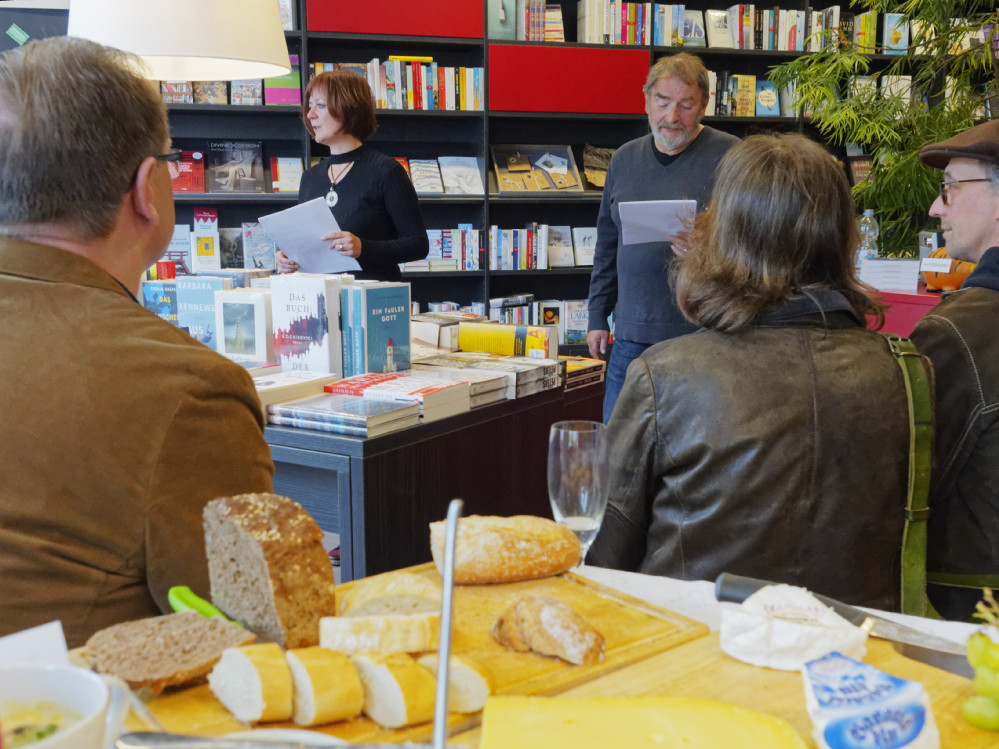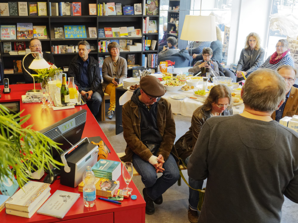Die Bücher mussten den Buletten weichen. Zur kleinen Eigentümer-Wechsel-Feier in der Buchhandlung Litfass gab es nicht nur Kriminelles zu hören, sondern auch vieles Kulinarisches zu schmecken: Suppen und Salate, Kuchen und Käse, Buletten und Brot. Das 22-köpfige Team um den neuen Chef und langjährigen Kollegen Karsten Schulz hatte aufgetischt.