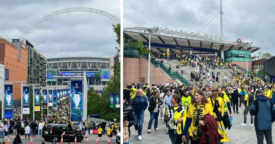 Zehntausende BVB-Fans sind in London – viele davon ohne Ticket. Dennoch haben sie Spaß und sorgen für Stimmung. Die Glücklichen mit Ticket sind mittlerweile auf dem Weg ins Stadion bzw. dort angekommen.