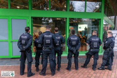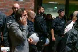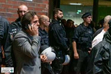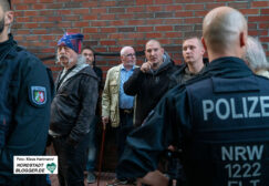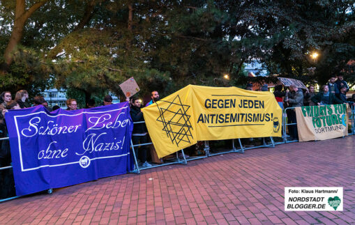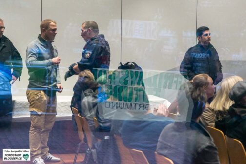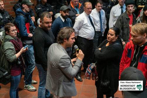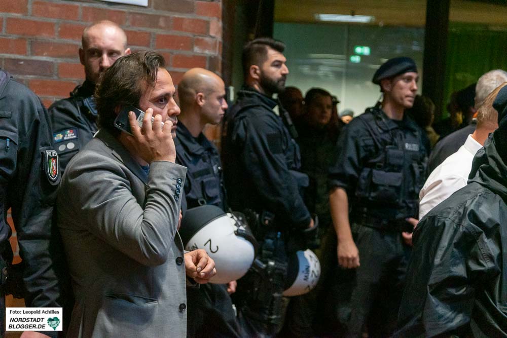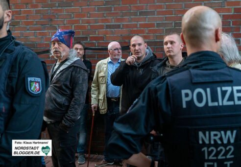 Die hatten das DKH-Gelände unter Buhrufen mit einer Polizeieskorte betreten. Darunter Siegfried („SS-Siggi“) Borchardt, Sascha Krolzig (Co-Bundesvorsitzender der rechtsextremistischen Splitterpartei Die Rechte) und Michael Brück (Bundesgeschäftsführer).
