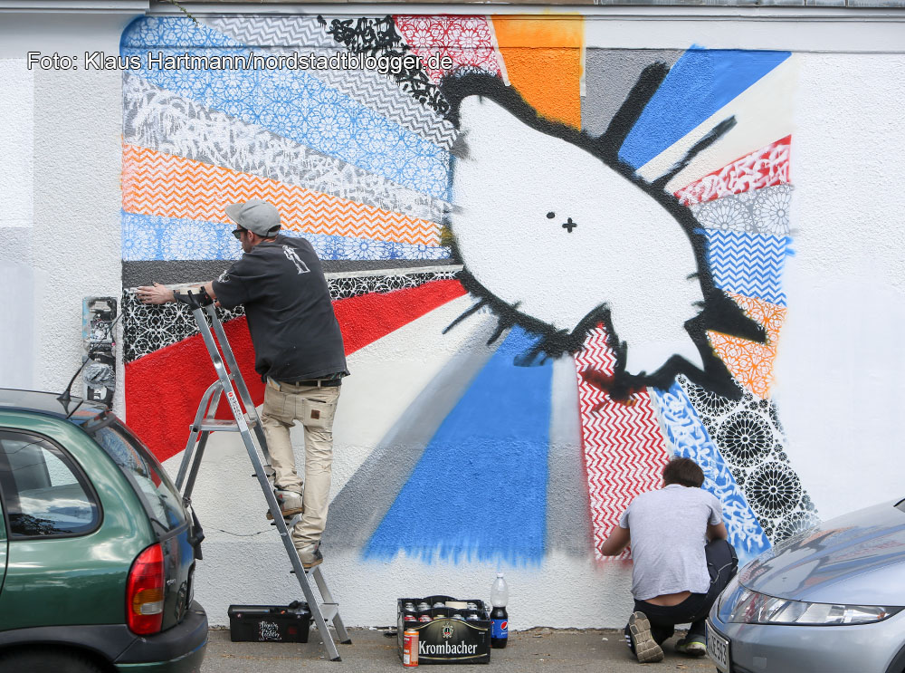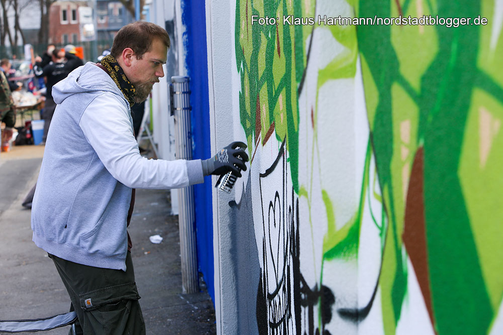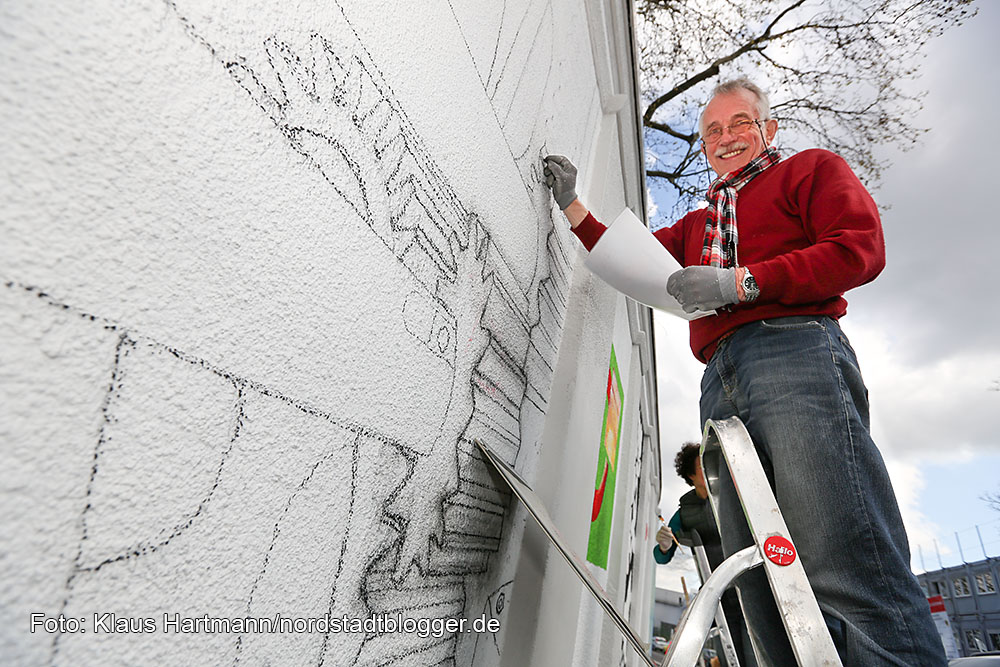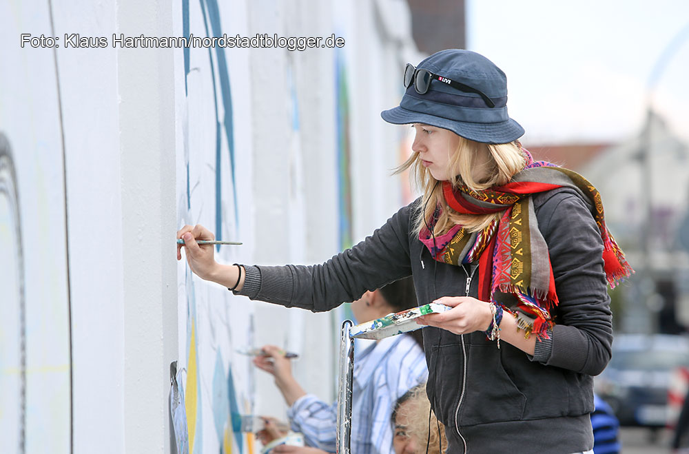 Gleich nach der Mauer hinter der Eisenbahnbrücke beginnt die Nordstadt. Das Entree zum Stadtbezirk soll statt Tristesse nun Lebensfreude vermitteln. Dafür sorgen an zwei Wochenenden 52 Künstlerinnen und Künstler zwischen zwölf und achtundsechzig, wie Peter Krüger.