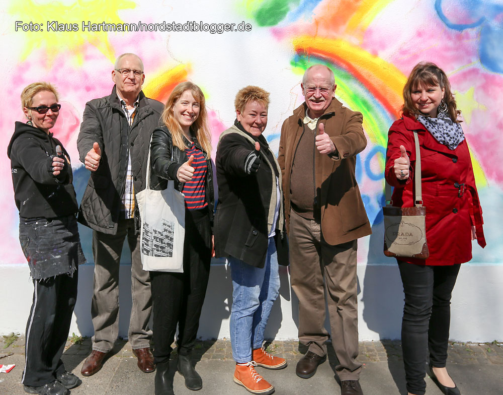 Mauer Galerie, Streetart 2015 in der Weißenburger Straße am Kraftwerk. Sponsoren, Organisatoren und Bezirksbürgermeister Ludwig Jörder, 2. v. rechts