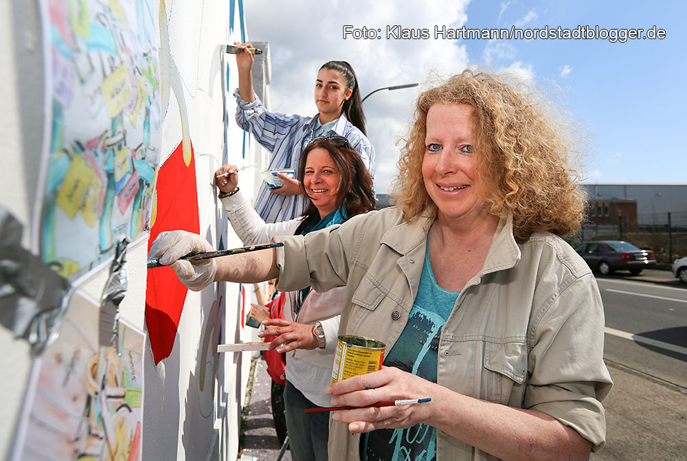 Mauer Galerie, Streetart 2015 in der Weißenburger Straße am Kraftwerk. Claudia Müller, vorne, vom Kunstprojekt "So geht Kunst" und Annette Goeke und eine Jugendliche aus dem Projekt malen an ihrem Werk