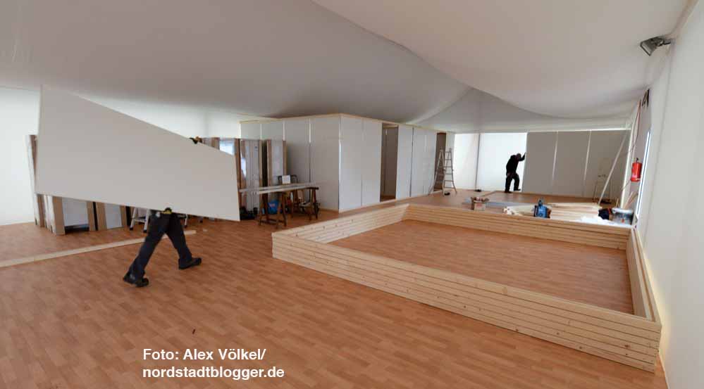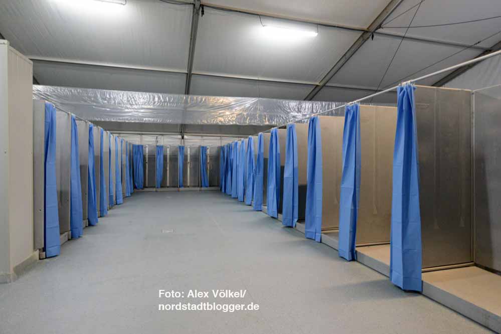 Der südliche Teil der Fläche ist als Schlafbereich vorgesehen. Dort wurden 15 winterfeste Leichtbauhallen (25 x 10 Meter) für jeweils bis zu 72 Personen aufgestellt.