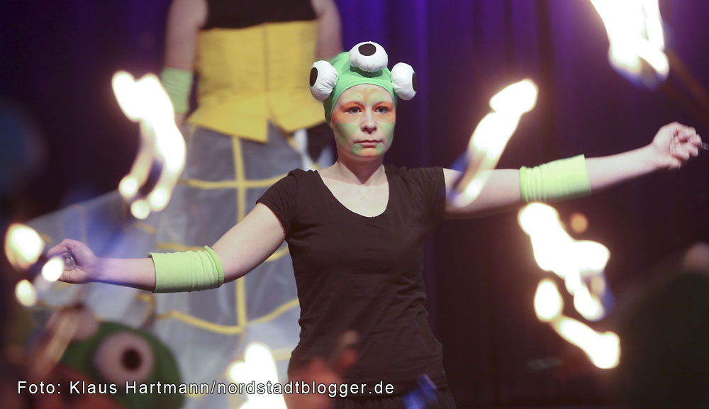 Plötzlich wechselt die Szenerie in den Außenbereich des Dietrich-Keuning-Hauses. Durch die Fenster beobachtet das Publikum das Eintreffen von Aliens, die mit einer Feuerjonglage überraschen.