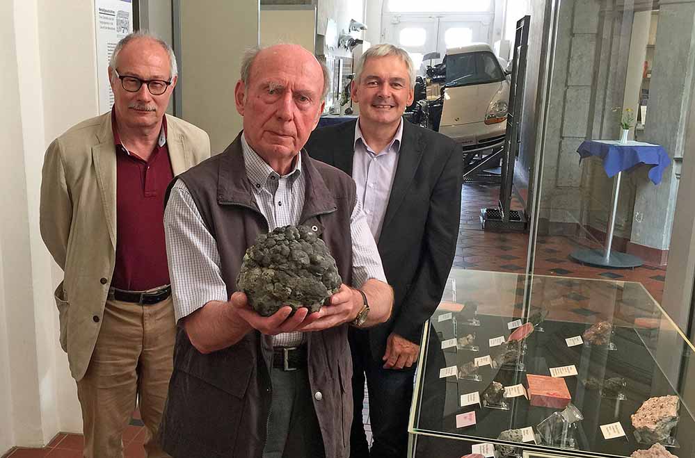 Geologe Dr. Wolfgang Homann (Mitte) mit einer Manganknolle. Links: Dr. Karl Lauschke, Vorsitzender des Fördervereins, rechts Museumsleiter Michael Dückershoff.