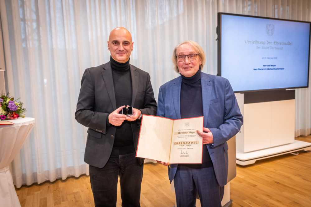 Zwei verdiente Dortmunder sind mit der städtischen Ehrennadel ausgezeichnet worden. Oberbürgermeister Alexander Kalouti verlieh sie im Rathaus im feierlichen Rahmen an Michael Küstermann und Olaf Meyer. Gewürdigt wurden ihr Einsatz für Kirche, Kultur, Soziales sowie Demokratie und Zusammenhalt.