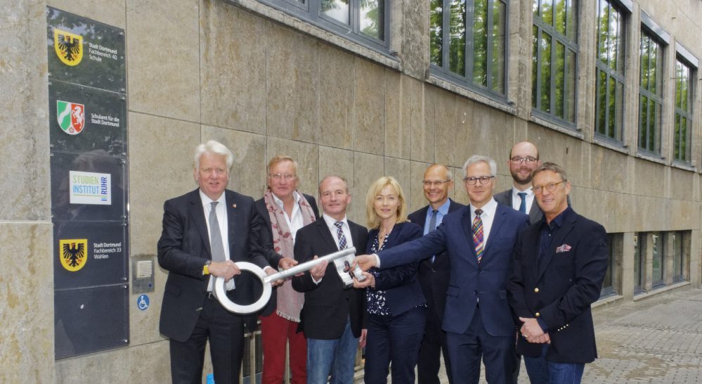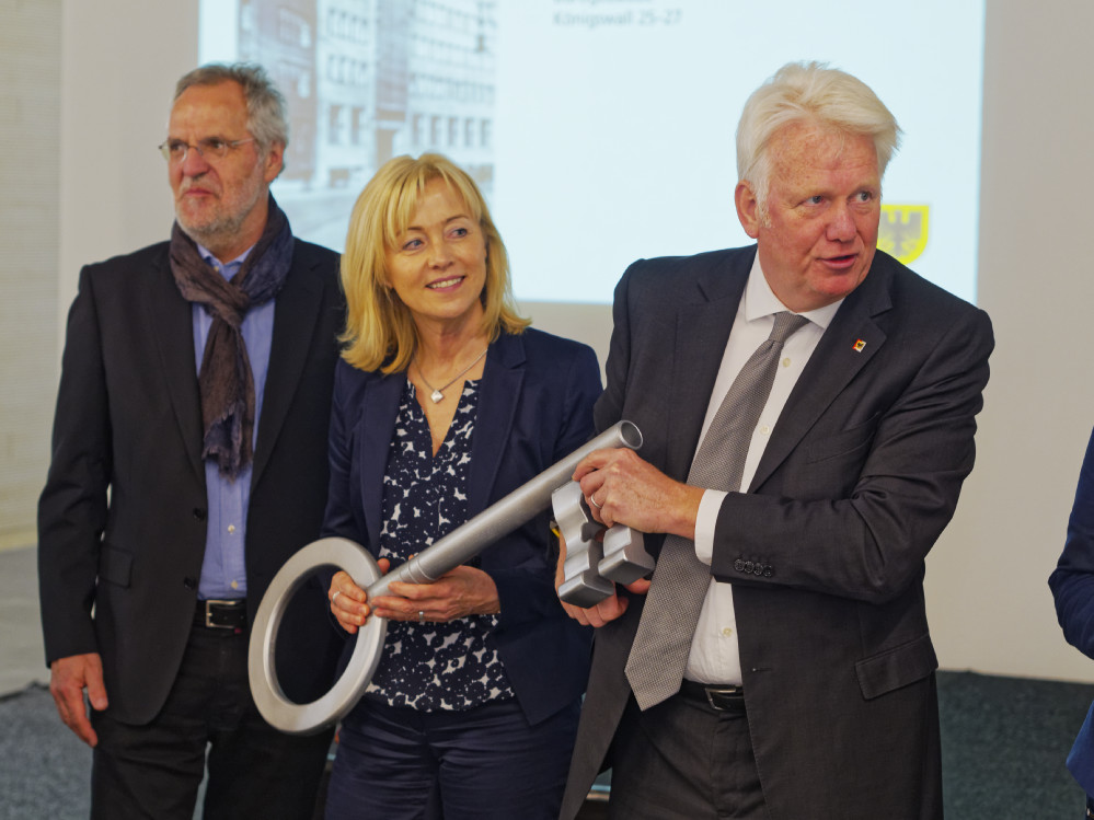 Vor Gästen aus Politik und Verwaltung der Städte Dortmund, Bochum, Hattingen, Herne, Lünen, Selm und Witten übergab Oberbürgermeister Ullrich Sierau jetzt symbolisch den Hausschlüssel an die neuen und einen alten Nutzer des Gebäudes Königswall 25-27. Innerhalb von nur zwölf Monaten gelang es den beteiligten Firmen und der Verwaltung, diesen „Monumentalbau“ seit Beginn der Arbeiten im April 2016 umzubauen und zu sanieren. Das Investitionsvolumen des Gesamtprojektes beträgt rund 9,7 Millionen Euro.