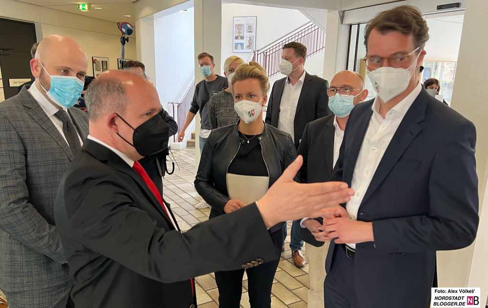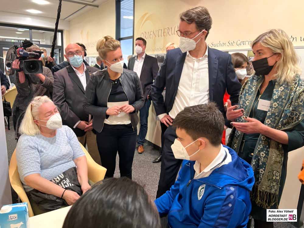 Nach einer kurzen Unterhaltung mit einigen Flüchtlingen wurde Henrik Wüst durch die Einrichtung geführt. Anschließend gab es ein Gespräch mit Ehrenamtlichen. „Unser Land zeigt sich hier von seiner besten Seite und ich bin allen Ehrenamtlichen sehr dankbar”, drückte auch Hendrik Wüst sein Lob für das Engagement der über 350 Freiwilligen allein hier in Dortmund aus.