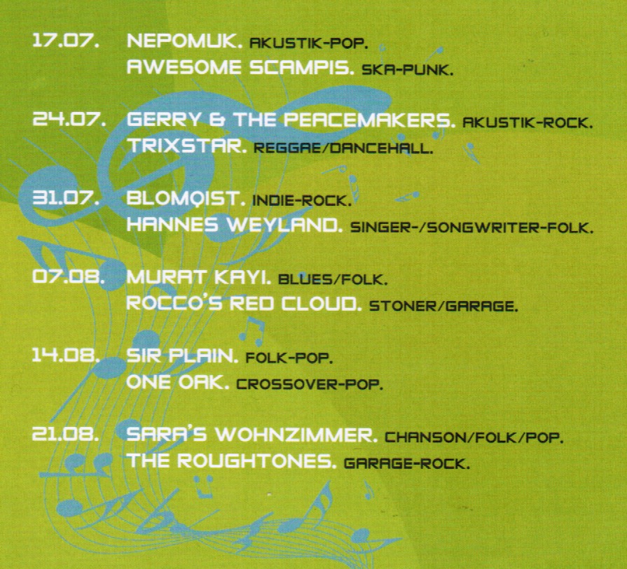 Es wird wieder einen höchst interessanten Stil-Mix geben – vom Reggae über Ska-Punk oder Indie bis hin zu Blues, Akustik-Pop oder Stoner- Garage. Bis zum 21. August gibt es jeden Sonntag um 12 Uhr Konzerte auf dem Nordmarkt.