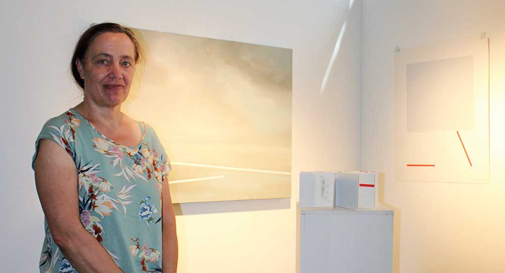 Bärbel Thier-Jaspert nähert sich dem Thema minimalistisch, reduziert, zum einen mit einer Malerei, zum anderen mit einem selbstgebauten Objekt, das die linearen Formen eines Siebdrucks Fischers aufgreift.
