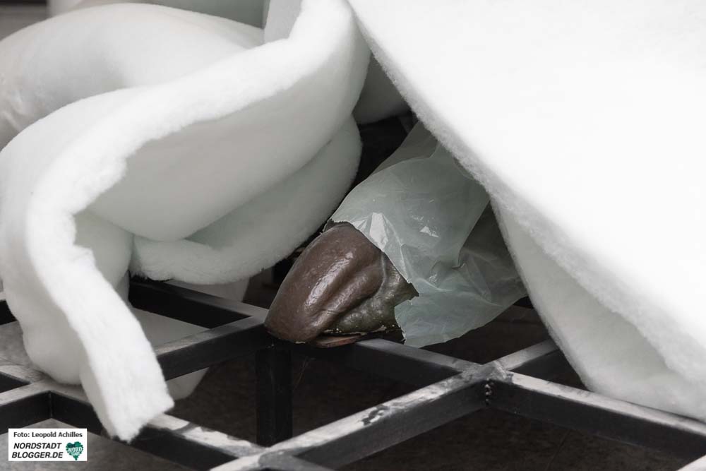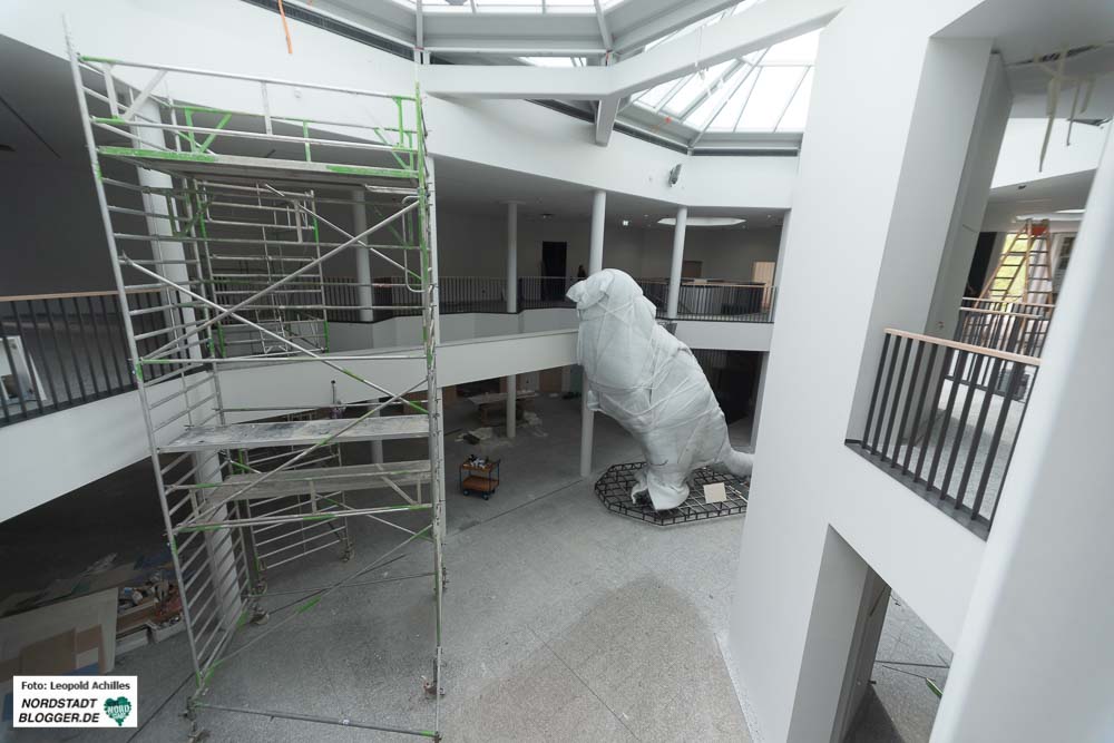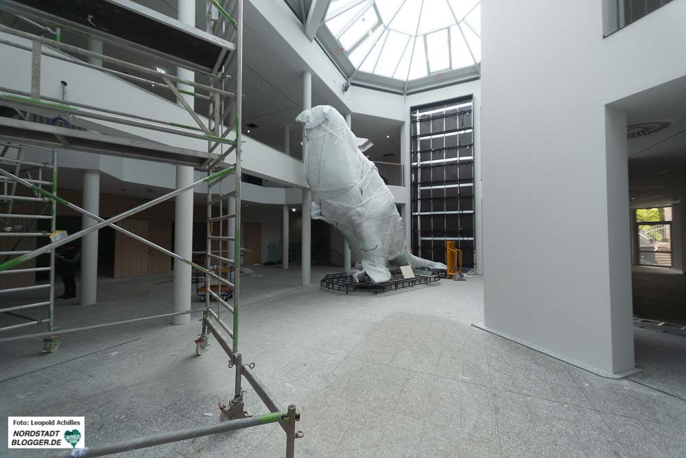 Fest verpackt und Christo-ähnlich verschnürt wartet der riesige Iguanodon-Saurier in der Halle des Naturkundemuseums an der Münsterstraße in der Nordstadt auf seine Befreiung. Nur ein einzelner Zeh blinzelt aus der dicken Schaumstoffhülle, die ihn umhüllt. Doch er wird auf seine Erlösung noch ein Jahr warten müssen, bis das Museum wieder eröffnet. Großer Wunsch von Museumsdirektorin Dr. Dr. Elke Möllmann: „Auf jeden Fall rechtzeitig zur Museumsnacht 2019“.