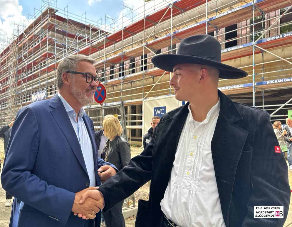 Im Juli 2024 wurde der erste Spatenstich von Thomas Westphal ausgeführt. Dieser ist nun auch wieder beim Richtfest dabei und sieht sich den heutigen „Klopper“. „Das Richtfest ist eines der schönsten Feste im Handwerk“ betonte Westphal. Und das nicht nur wegen des Richtkranzes und dem Schnaps.