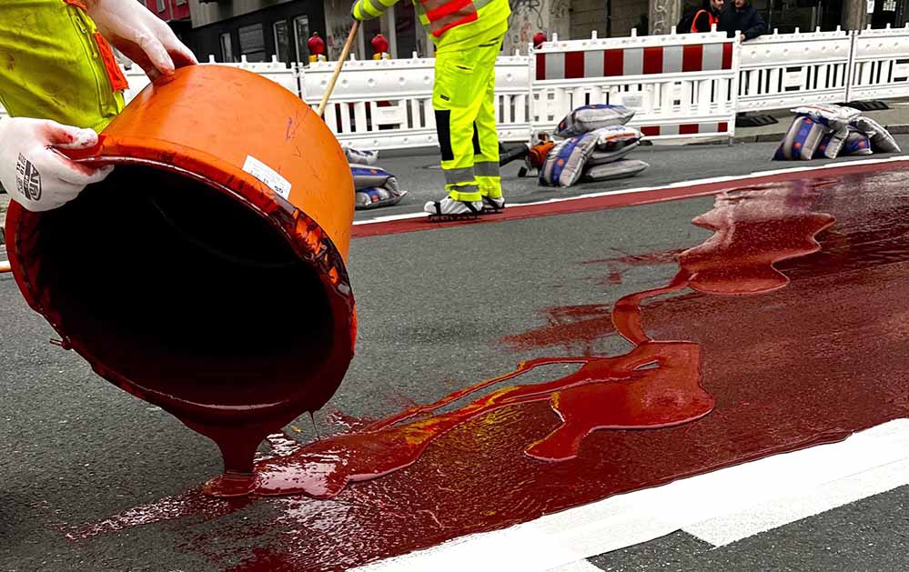 Die Fahrbahn der Nordstraße erhält eine rote Beschichtung aus besonders rutschfestem Epoxidharz. Auf Krim- und Leuthardstraße kommt die vollständige Rotbeschichtungspäter – hier muss zunächst die Fahrbahnsanierung saniert werden. Foto: Max Kumpfer für die Stadt Dortmund