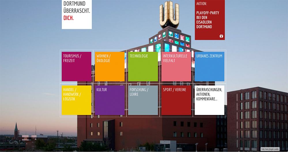 Zentrales Ziel der auf zwei Jahre angelegten Kampagne „Dortmund überrascht. Dich.“ ist es, die Veränderung und Erweiterung des Blicks der Öffentlichkeit auf Dortmund zu forcieren.
