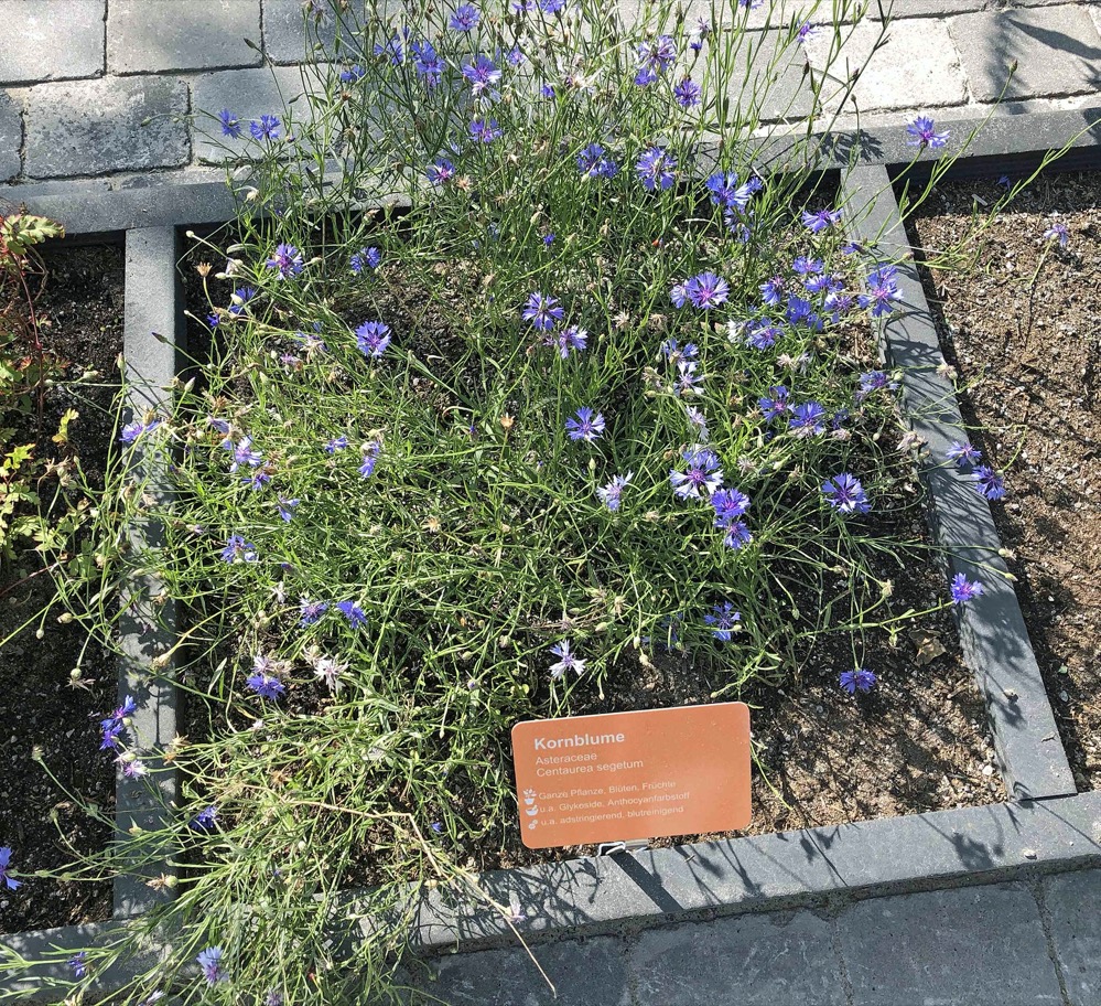 Rot gekennzeichnete Heilpflanzen wie zum Beispiel Eisenhut, Herbstzeitlose und Fingerhut weisen – je nach Dosierung – auf eine erhöhte Giftigkeit hin. Mit Upcycling-Material („Das kommt aus der grünen Tonne“, so Dr. Knopf) sind die Pflanzbeete umrahmt. Sie wirken optisch wie aus Stein, sind aber aus wieder aufbereiteten Kunststoff.