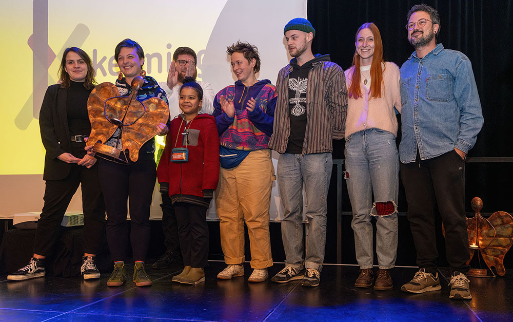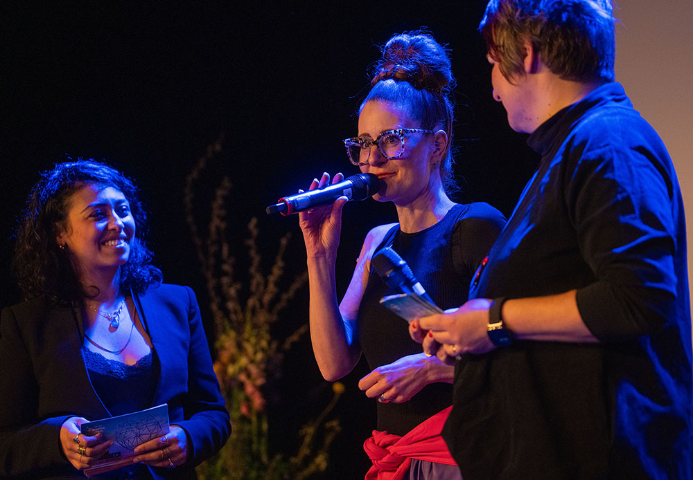 Zur ersten Engelübergabe – die Kunstwerke fertigt von Beginn an Thomas Holzmann, ein Künstler aus Unna – kam wieder Hannah Rosenbaum auf die Bühne, dieses Mal als Laudatorin. Sie würdigte die Arbeit des Gartenkollektivs freilicht.nord, das an der Straße Bleichmärsch 61 aus 500 Quadratmetern versiegelter Fläche eine grüne Oase gemacht hat.