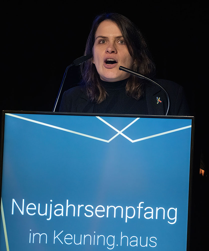 Bezirksbürgermeisterin Hannah Rosenbaum wurde in ihrer Ansprache sehr persönlich angesichts der politischen Situation in vielen Ländern der Welt und in Deutschland. Aber sie wolle nicht resignieren: „Was mir Hoffnung gibt, sind die 30.000 Menschen in Dortmund und die mehr als eine Millionen in Deutschland, die gegen die Pläne der Deportation protestieren.“