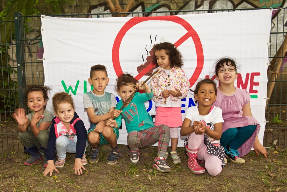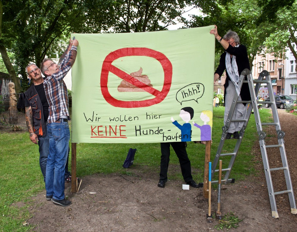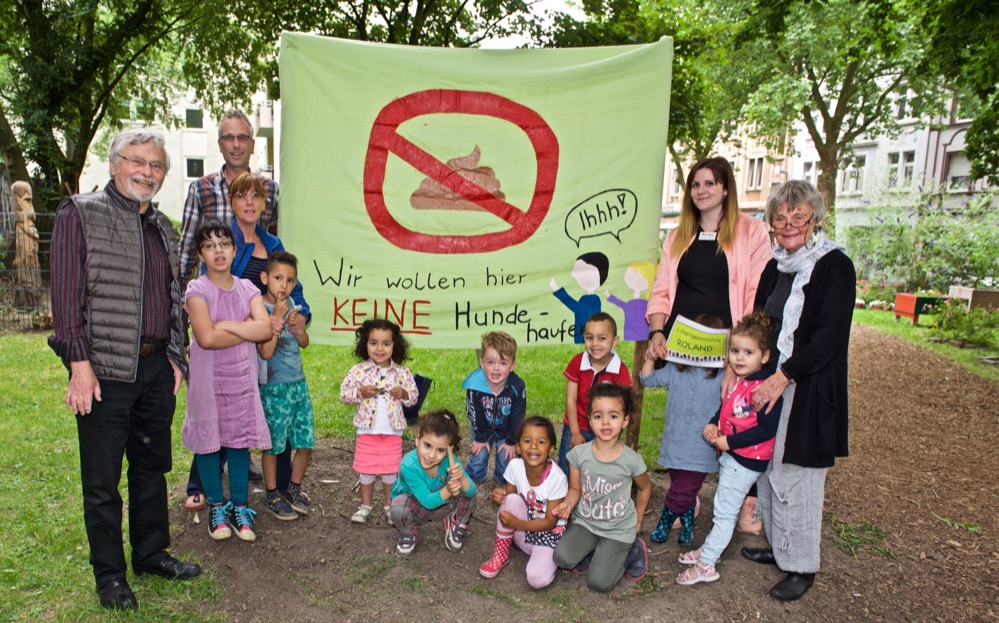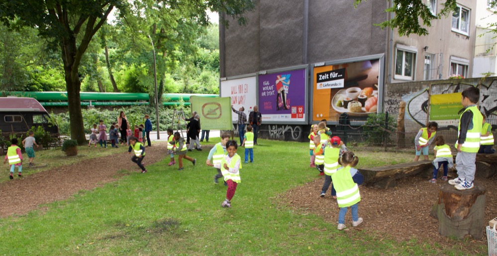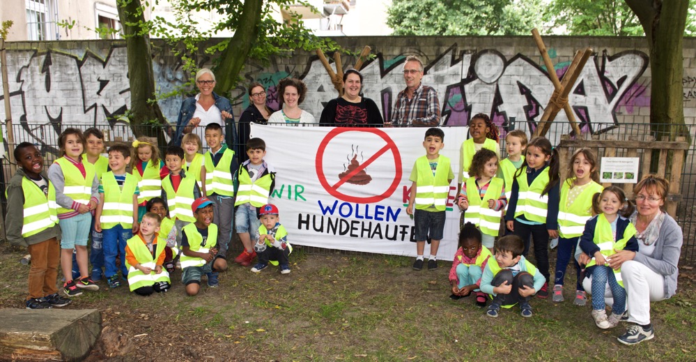 Nun haben die Kinder des katholischen Familienzentrums Haus der Generationen und der evangelischen TEK Rolandstraße in Zusammenarbeit mit dem Familienbüro Innenstadt-Nord große Banner zu diesem Thema gestaltet und im Bürgergarten angebracht, um auf das Problem noch einmal aufmerksam zu machen.