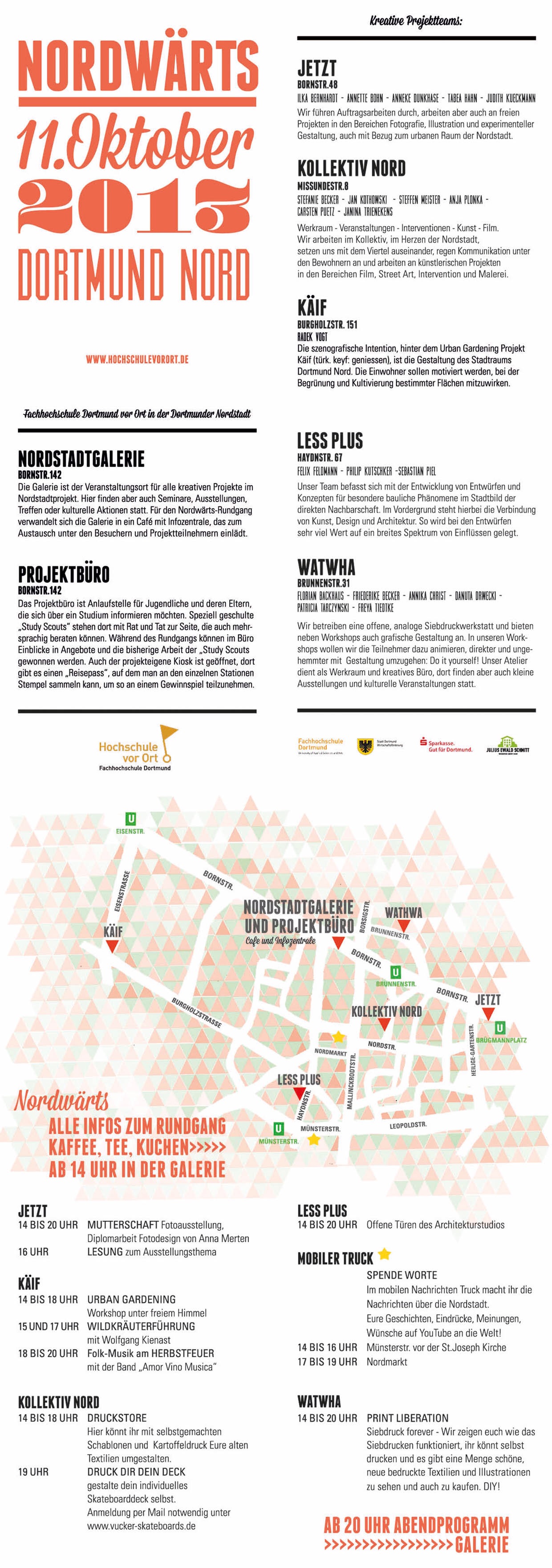 Nordwärts„Wissenschaft meets Nordstadt“: Am 11. Oktober öffnen die freien Ateliers aus dem Nordstadtprojekt der Fachhochschule (FH) Dortmund in der großen Veranstaltung „Nordwärts“ ihre Türen. JETZT, KOLLEKTIV NORD, KÄIF, LESS PLUS und WATWHA heißen die Ateliers und Projekte, die seit einem Jahr in der Nordstadt arbeiten und von der FH und der Wirtschaftsförderung im Rahmen der „Hochschule vor Ort“ gefördert werden. Die Veranstaltung wird von dem Quartiersmanagement Nordstadt und der FH unterstützt.