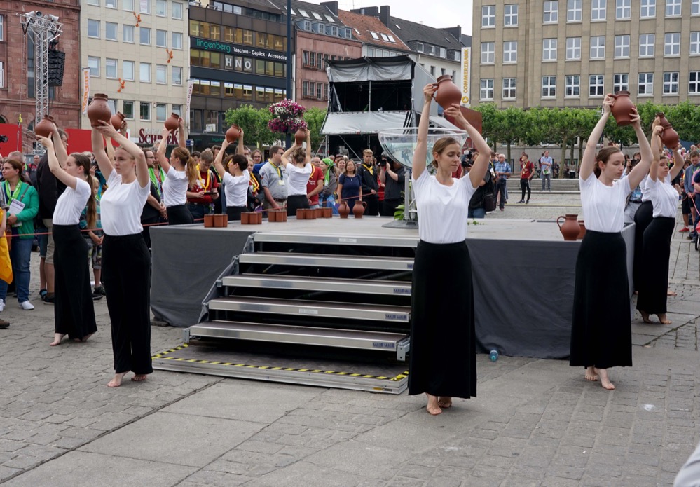 Der Ausdruckstanz vom JugendTanzTheater des Balletts Dortmund hebt die herbeigetragenen Wasserkrüge hervor. Junge Helferinnen zeichnen mit dem Wasser aus diesen Krügen den zahlreichen Gottesdienstbesuchern ein Kreuz auf die Stirn. „Mit jeder Taufe und Tauferinnerung dürfen wir erspüren: Gott hat uns gerettet: Aus den lebensbedrohlichen Fluten in erfrischendes, Durst stillendes Nass; aus Lebensgefahr hat Gott uns mit schöpferischer Kraft aus einer Tiefe in das Leben hier und jetzt, heute in Dortmund und morgen irgendwo in dieser Welt hineingehoben“, heißt es in der Predigt, die Superintendentin Heike Proske für die Evangelische Kirche und Propst Andreas Coersmeier für die Katholische Kirche in Dortmund abwechselnd sprechen.