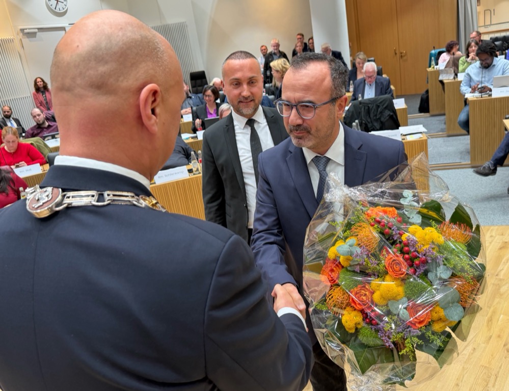 Alexander Kalouti (CDU) wurde bei der konstituierenden Ratssitzung offiziell in sein Amt eingeführt. In seiner Ansprache nach der Vereidigung betonte er die Themen, die ihm schon im Wahlkampf wichtig waren: Sicherheit und Ordnung, Kitas und Wirtschaft. Und einen Appell für gesellschaftlichen Zusammenhalt.