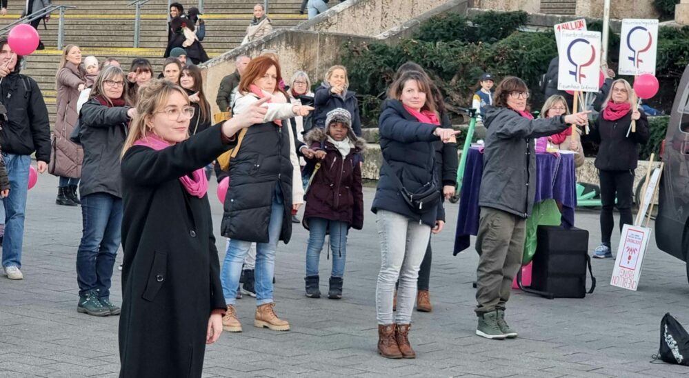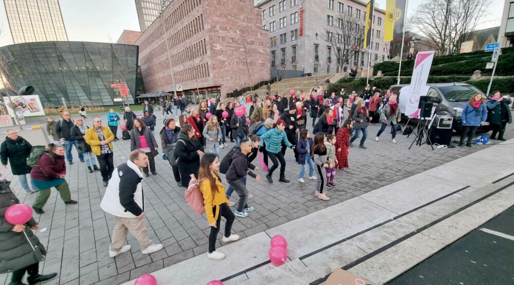 In Dortmund war es der Verein „Frauen helfen Frauen“, der einen Flashmob vor der Katharinentreppe organisierte. An diesem belebten Ort haben sie ein Zeichen gegen Gewalt an Frauen gesetzt, um „die Öffentlichkeit darauf aufmerksam zu machen, dass Gewalt gegen Frauen und Mädchen keinen Platz in unserer Gesellschaft hat”.