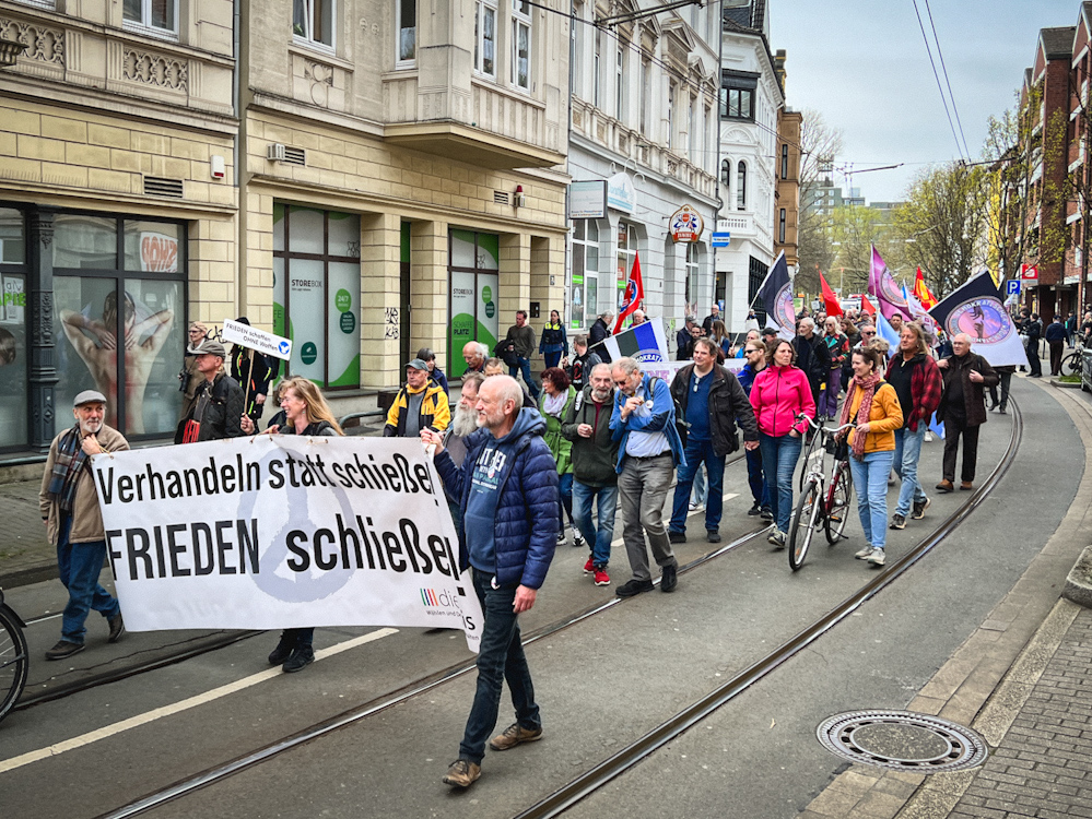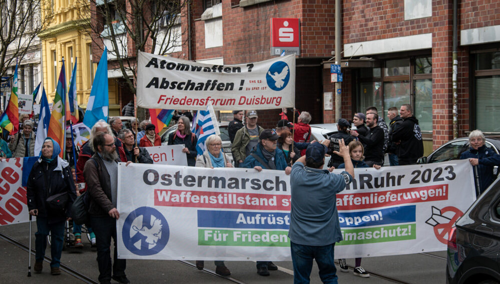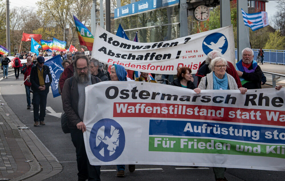 Mit dem Ostermarsch treten wir mit allen demokratischen, sozialen, ökologischen und antirassistischen Bewegungen für eine friedenspolitische Wende ein. „Gegen die atomare Bedrohung gemeinsam vorgehen! Die Kriege beenden, die Aufrüstung stoppen! Friedensfähigkeit statt Kriegstüchtigkeit!“ so lautet das Motto der Ostermarschierer:innen bei ihrer dreitägigen Friedensaktion an Rhein und Ruhr.