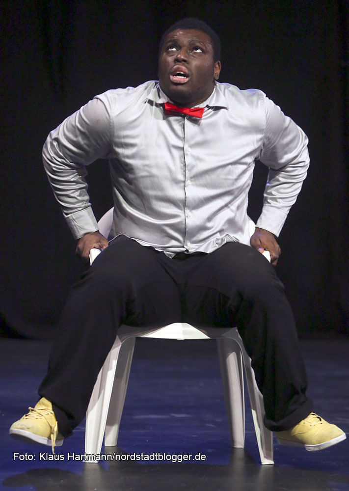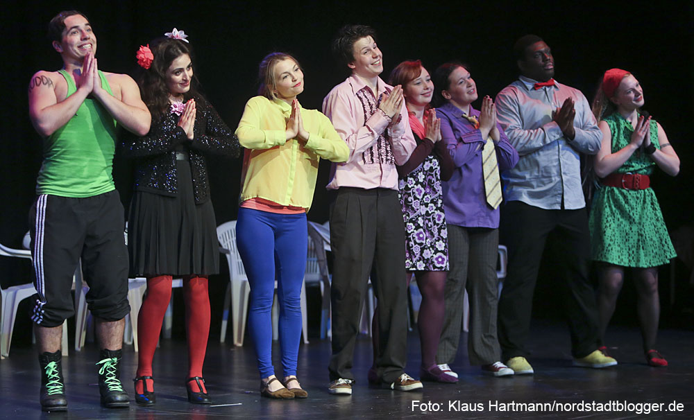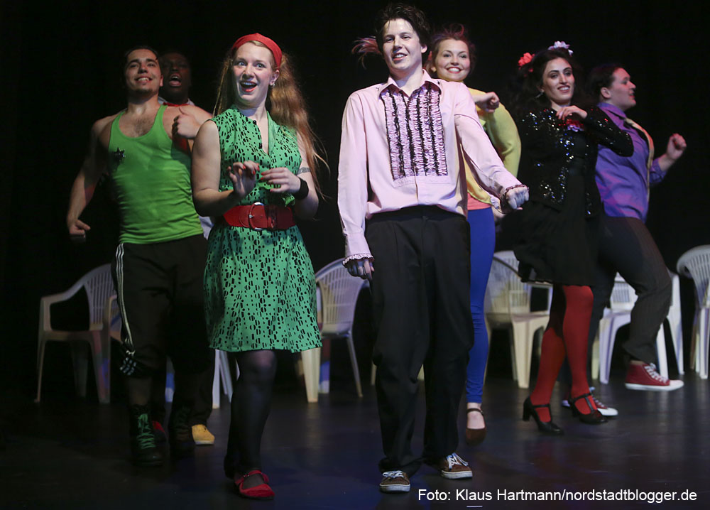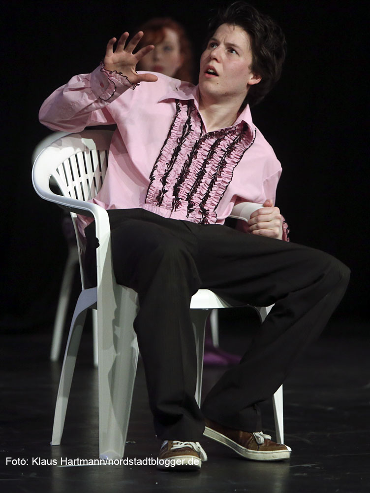 Dem eingangs schon erwähnten Programmfaltblatt ist zu entnehmen, daß hier „Teilnehmer der Volkshochschule Dortmund, Studierende des Westfalen-Kollegs Dortmund, ehemalige Studierende und Studenten der Ruhruniversität Bochum“ gemeinsam auf der Bühne stehen. Ein recht heterogenes Klübchen mithin, was man dem Spiel auch anmerkt, einige Akteure wirken hoch professionell, andere weniger. Mit einem solchen Personal zu einer passablen Ensembleleistung zu gelangen ist sicherlich nicht ganz einfach, hier aber überzeugend gelungen. Frenetischer Schlußapplaus.