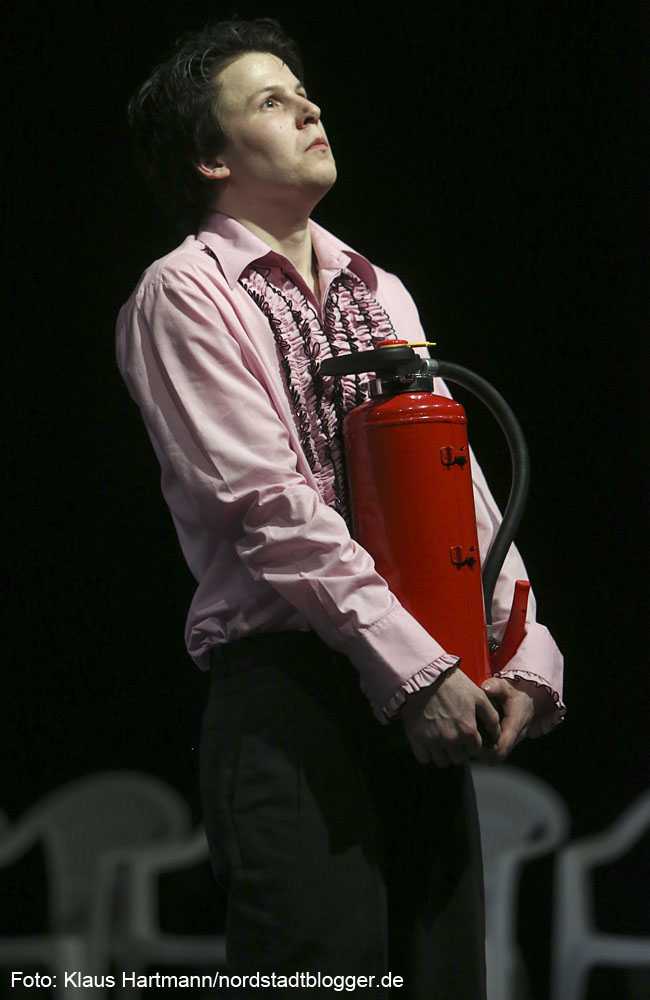 So wird „Peng!“ auch zu einer Art präinfernalem Typenkabinett, in dem der drohende Untergang streckenweise in den Hintergrund tritt. Da gibt es eine schwarzhaarige Schönheit, deren Problem indes ist, daß sie kaum ein Wort herausbringt, so sehr sie sich auch anstrengt; eine kleine giftige Prinzessin beschimpft das Publikum, ein Feuerwehrmann kündigt für den weiteren Verlauf des Abends noch eine Brandstiftung im Zuschauerraum an, und so fort. Außerdem gelangen Gedichte von Schwitters zum Vortrag, Liebeslyrik gar, doch kommen sie in der vorwiegend burlesken Hektik des Bühnengeschehens nicht so recht zur Geltung. Nun ja.
