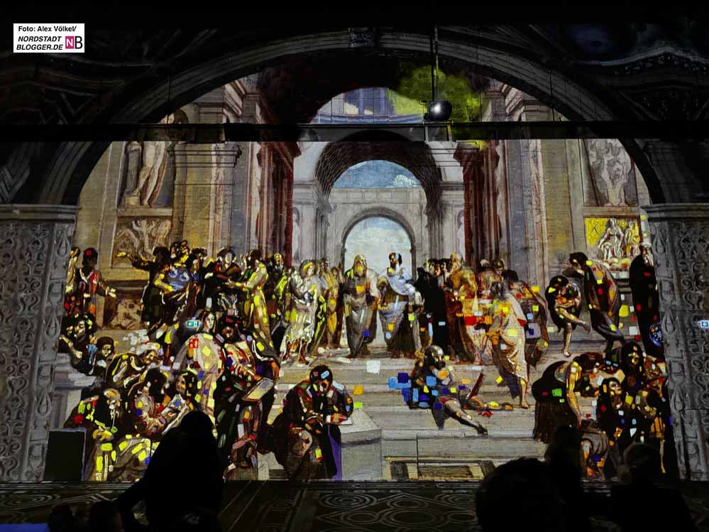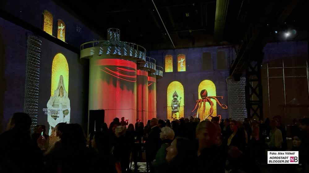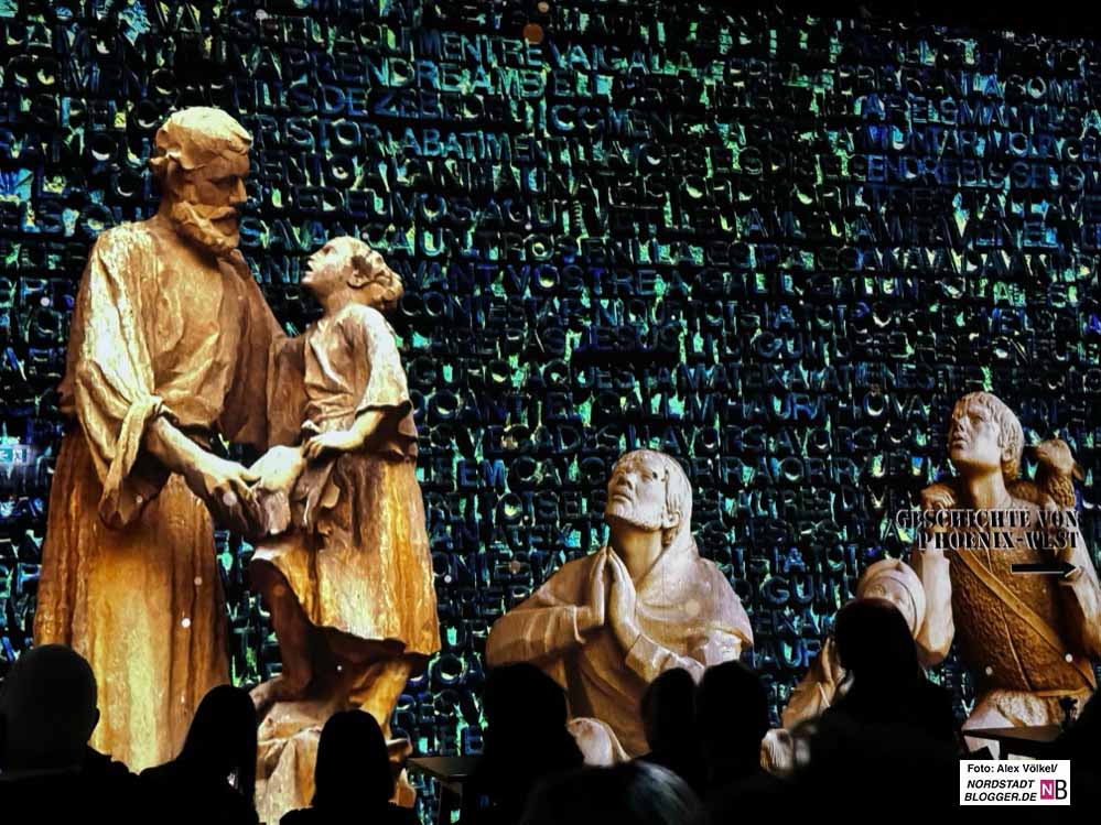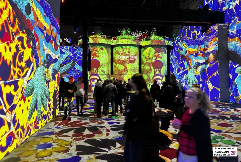 Phoenix des Lumières erhält durch ein Zusammenspiel von Licht und den Besonderheiten der Phoenixhalle die Anmutung von Gewölben, schrägen Säulen und wellenförmigen Fassaden und nimmt die Besucher:innen mit auf eine Reise zwischen Traum und Wirklichkeit. Eine stimmige Schau, die gut zum Ort auf Phoenix-West passt.