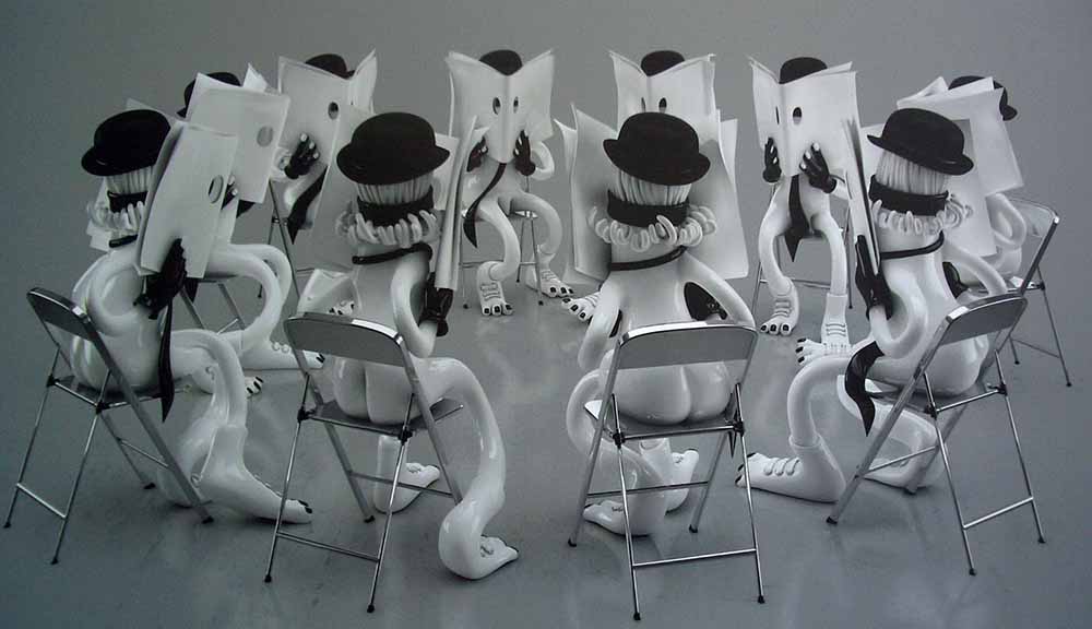 Mark Gmehling sitzt mittlerweile tagelang am Computer und gibt seiner Digital Art statt auf der Straße am Schreibtisch den letzten Schliff. Seine von Hand gezeichneten Figuren erweckt er am PC als Polymere zum Leben. So perfekt ihre gesichts- und geschlechtslose Gestalt, so kaputt ihr Dasein: absurd, trivial, emotions- und beziehungslos. Seine Kunststoff-Kerlchen leben in einer künstlichen Welt und erzählen trostlose Geschichten.