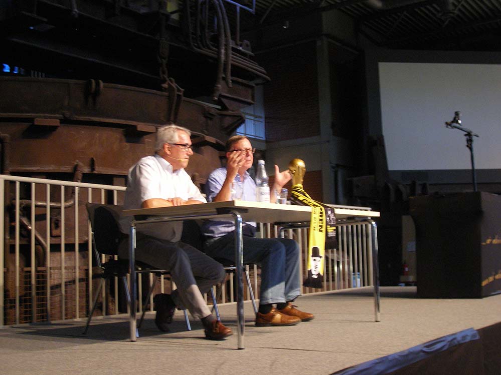 Humorvoll ging es auch in der großen Stahlhalle zu. Hier trat am frühen Abend zunächst Gerd Kolbe mit einer Lesung aus seinem Buch „Die magische 6 des BVB“ auf. Unterstützt wurde der renommierte BVB-Archivar vom ehemaligen Chef des Museums für Kunst- und Kulturgeschichte in Dortmund, Wolfgang E. Weick. Gemeinsam klärten sie das zunächst recht verhaltene Publikum sowohl humorvoll als auch informativ über die lange Geschichte des BVB auf.